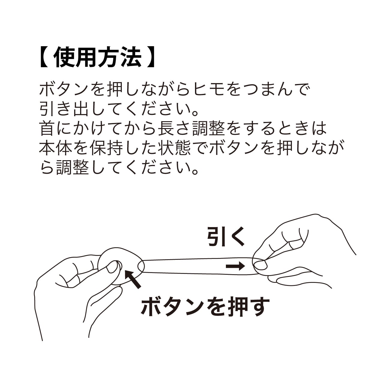 ボタンひとつで紐部分(ストラップ)の長さを自由に調整・固定することができ、必要な時だけ、必要な長さに調整できる使い勝手の良さが特徴。